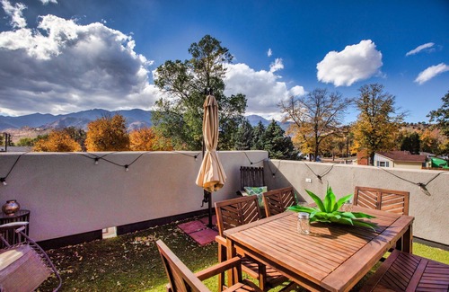 The private rooftop terrace with views of Pikes Peak is perfect for enjoying a sunrise coffee, and a sunset evening with friends and family.
