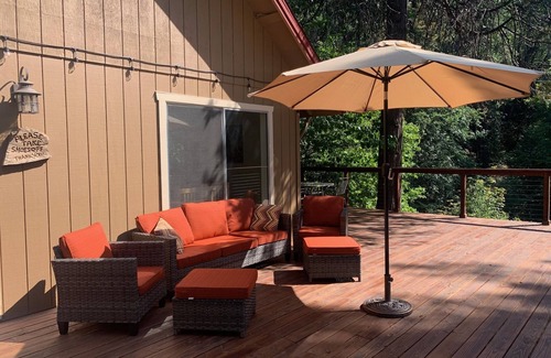 Enjoy the forested creek side setting of this serene home on 6 private acres set amongst mature pine and fur, oak and madrone trees. This spacious 3 level, well appointed, 5 bedroom, 3 full baths , 3000+ sq. ft. home will not disappoint! Additionally it comfortably sleeps 12 people. Three of the bedrooms are master bedrooms with convenient bathroom access. There are two family rooms adorned with sofa’s and love seats, televisions, dvd players and fireplaces as well as a huge detached game room with its own wood stove fireplace.