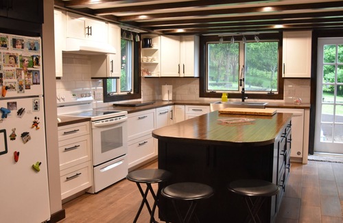 Upstairs there are 6 bedrooms, including the huge "Church Room" with a King Size bed, that boasts a beautiful stained glass window; the "Cedar Room" with a California King Bed; two bedrooms with en-suite bathrooms; as well as two smaller bedrooms - one with a bunk bed. There are also two more bathrooms upstairs. All bathrooms have been remodeled in 2019 - 2020.