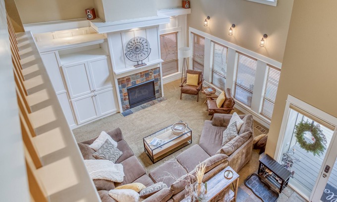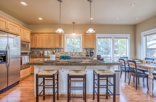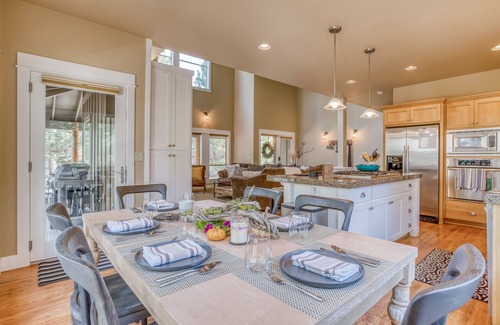 Stay only a few minutes' walk to the gorgeous Deschutes River in this newly furnished contemporary home in the desirable River Wild neighborhood of Mt. Bachelor Resort. With its soaring two-story vaulted ceiling, the living room is bathed in light, making it an inviting space to gather to watch your favorite movies and shows on the giant, comfy couch or for conversation by the cozy gas fireplace. The modern, open-floor-plan kitchen is fully stocked with all of the cooking must-haves featuring a gas cooktop on a granite island, stainless steel appliances, brand new stainless steel pots and pans, a crockpot, a coffee maker, lots of serving pieces.