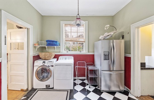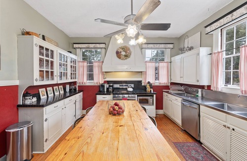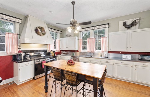Experience the blend of historic charm and modern convenience with a variety of amenities designed for comfort and entertainment. The chef's kitchen boasts stainless steel countertops and is fully equipped for culinary adventures, making it ideal for hosting pre-wedding brunches or dinner parties. With five spacious bedrooms, including two luxurious master suites, your bridal party can enjoy restful nights before the big event. Highlighted by elegant living spaces such as a formal dining room that seats up to 12 and a cozy den perfect for relaxing or playing games, every inch of this home is thoughtfully curated to enhance your wedding experience.