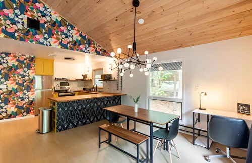 Our cabin has two private bedrooms both with queen beds. There is a pack-n-play in the closet for little ones. There's one full bathroom and a large kitchen. We have a washer and dryer in-unit and an open-concept living space equipped with a futon sleeper sofa, dining table, flatscreen TV, working fireplace, and Wi-Fi. We also have large sliding doors that open up to our wide deck fitted with outdoor seating. We also have an area dedicated to a firepit.