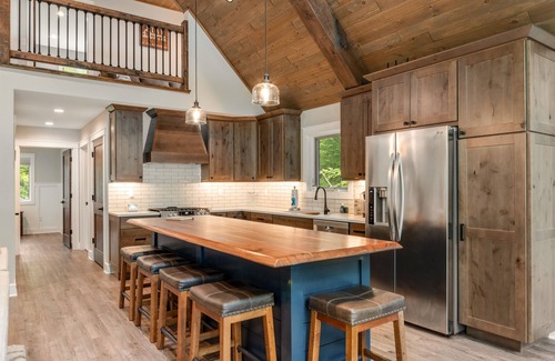 Inside, you’ll find a modern cabin vibe, with light, tranquil colors blended with the feel of an Aspen ski lodge. The open floor plan is ideal for reconnecting with family and friends, and the modern, spacious kitchen is a dream for the group’s chef, with lots of cabinetry, counter space, and a full suite of stainless steel appliances. Between the three-season porch, dining room table, and kitchen barstools, there’s plenty of room for everyone at mealtime.