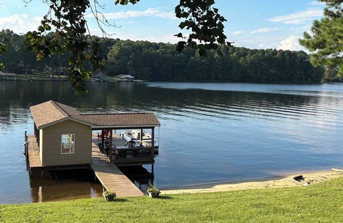 Spacious lake front home with large boat house partially covered for shade and a rare sandy beach. This west-facing property on the popular Hamlin Cove is a fantastic newer home on the Littleton side of Lake Gaston. Our home welcomes you with a warm and spacious living area that is perfect for accommodating large families/groups in a fantastic lakefront location. The beautifully decorated house has a well appointed kitchen with stainless steel appliances, lakeside eating area, dining room and office/lounge, comfortable furnishings throughout and a screened porch with lots of great views of one of the most popular wakeboard/skiing coves on the lake! Lakeside amenities include boathouse TV and fire table, kayaks, stand up paddle boards and new outdoor shower. Whether playing corn hole in the backyard, relaxing on the pier, swimming in the lake, playing on the beach, playing pool in the game room, or simply enjoying the lake views from the house, a good time will be had by all!