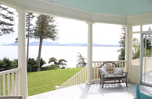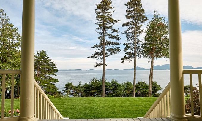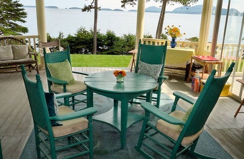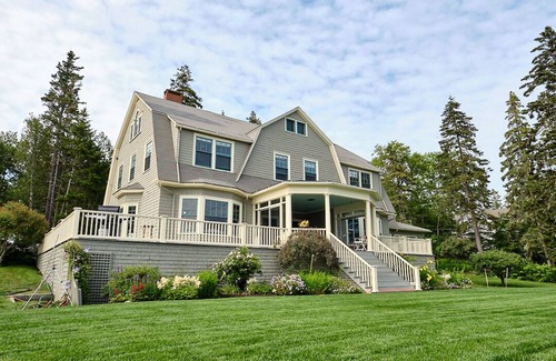A large beautiful waterfront home on the tip of a peninsula with truly spectacular views of Frenchman Bay and the beautiful mountains of Acadia National Park! Relax day or night on the large wrap-around porch, or play on the expansive lawn directly on the ocean. From your comfortable porch perch you can start the day watching lobster boats and seals, porpoises, eagles, and other sea life go by while sipping your favorite beverage and having breakfast. At night, watch the moon and stars sparkle or catch a shooting star on the water over dinner or drinks with family and friends. This 6 bedroom / 5 full bathroom property has the perfect combination of modern upgraded amenities, including high-speed internet, yet with a vintage New England feel. This is a large family home loved by many generations of the same family for its unique and incredible views, its game nights, and its authentic old-time feel. Perfect for a medium or large family, two families vacationing together, reunions, anniversaries, Maine adventures, a family hosting guests, or anyone with a desire for a glorious ocean-view house with plenty of cozy spaces and a welcoming community full of activities in the coveted Hancock Point.