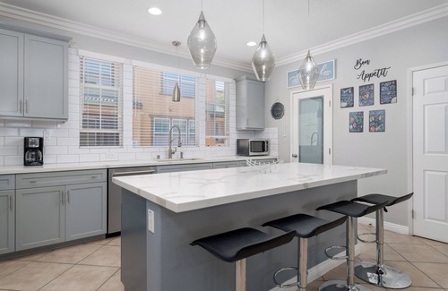 Living room area offers a light and bright open floorplan. The large open kitchen features quartz countertops, custom backsplash, large island with bar-stool seating and 2 pantries! Crown moulding throughout! Our home is beautifully furnished and boasts a fully stocked kitchen with all stainless steel appliances, cookware, coffee maker, flatware, dishes, cups, glasses. A classy glass desk is provided for any remote work you may want to do.
