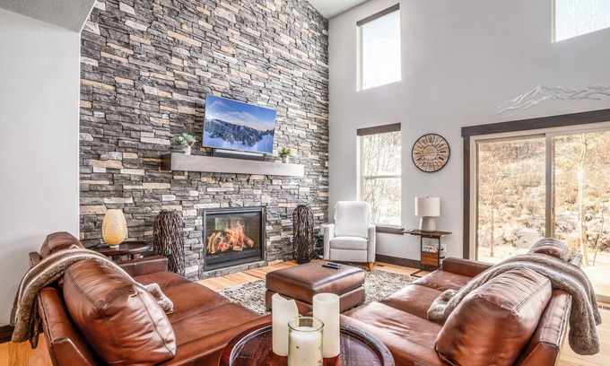 The property is equipped with streaming TV, high speed internet, central air conditioning, and a beautiful rocky mountain stone fireplace for cozy gathering. Expansive views of the townhome's nearby hiking and biking trails are abundant through the large windows, as the townhome backs up to beautiful open space and a 15-acre park.