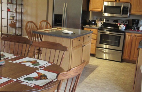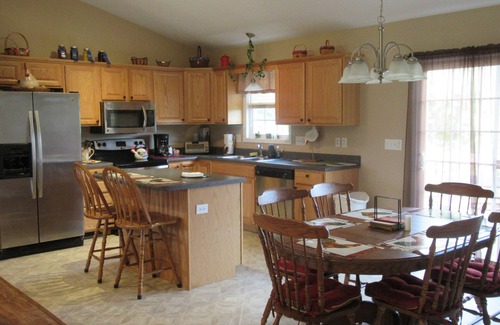 Vinyl siding Home built in 2012 on one level with a full basement. Long porch on front and deck on back with patio underneath. Master bedroom king size bed and large master bath with shower and garden tub. Two bedrooms, with queen beds . All bedrooms have walk in closets. Full bath with tub and shower in hall. Family room and eat in kitchen combination with stainless steel appliances and cathedral ceiling. Laundry room with washer and dryer furnished. Full walk out finished basement with ground level patio. Great room with propane gas stove and game room with pool table. Second master bedroom with full shower bath, king size bed.