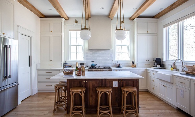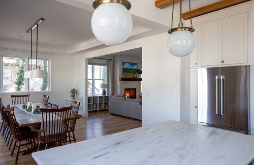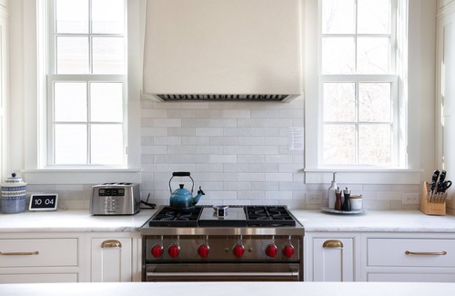 To the left of the dining room is the heart of our home: the beautiful kitchen. Every detail of this space was lovingly planned out, from the walnut island and marble countertops to the Wolf range and farmhouse sink. You'll find the fridge stocked with breakfast items for you to enjoy and standard condiments.