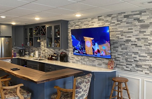 We take tremendous pride in our home and want our guests to enjoy it as much as we do but also treat it as if it’s yours. Newly constructed less than three year old 4,500 sq ft home by award winning contractor, Chris Arver. This gorgeous home is located ON the lake not across the street like others in the area. If your looking to rent for a week (June through August—weekly minimum ) or a couple of days (September through May— a 2-day minimum) some weekends on holidays are 3 day minimum such as (Memorial Day, labor Day and Columbus day) this is the ideal getaway home for you. Unlike many other older rental homes or cottages in the area—this home is less then 2 years old and everything is state of the art. So whether, it’s Summer, Fall, Winter or Spring this brand new home is perfect for your relaxing vacation. The home has 7 larger bedrooms (2 Masters one on main floor and one upper level); The first floor master is strategically located off the back entrance. This assures a more quiet zone for young babies to sleep and to perform work duties at home. It has a work station so working remotely from home is easy and convenient. Only one bedroom has bunk beds and it’s oversized the other 6 are Kings, Queens or Fulls. 5 full large baths all with walk-in showers and one is equipped with a soaking tub. 2 car attached garage that our renters can access during their stay.