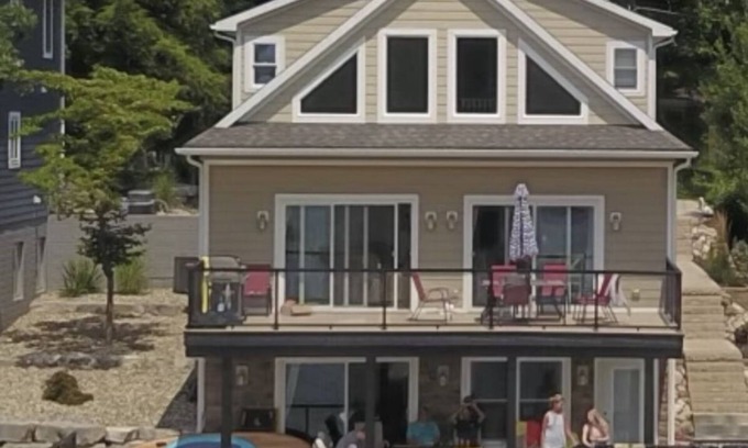 ATTENTION ATTENTION 4th of July pweek is now available Book your reservation now for your get away. Also rent any 2 nights In January through March and get a 3rd nite FREE. We do not allow any High School graduation or prom Parties even with parental supervision. No bachelor or bachelorette parties are permitted under any circumstances. We have upgraded this brand new 2 year old home even more in the Fall with $75,000 in new renovations. Underneath the deck has been coverd with aluminumin in order to use the fire stationYear Round during rain and snow. We also just replaced all the beds in the house to assure your stay will be extremely comfortable at bed time. But more importantly a brand new bar with loads of seating and a large screen 65” TV has been added to the lower level. We also added a built in entertainment center with fire place and 65” TV. This will make the house so much more appealing during the fall and winter months. We also added wanescoating and the whole house has been repainted. Strategically located 30-35 minutes from Notre Dame. What a great place to go for the holidays or a nice weekend get away year round. So now get ready to enjoy this beautiful new home on fun filled Round Lake all year long. So if going to all the nearby Winery’s or attending a Notre Dame football game 30-35 minutes away this is the perfect home for you. If a little gambling is your thing we have 2 Casinos within 15 minutes. This home is only rented a minimal amount of times so don’t hesitate to inquire now so you can book your reservation. Please take time to read the reviews and find out why it’s been voted Sister Lakes number 1 vacation home to rent. Renters love the fact this house has a state of the art water purifing/ filtration system. It also has 5 bathrooms all with showers and a master with a soaking tub to get the kids all cleaned up after a day on the Sandy Beach. It’s also the only lake in Sister lakes were you can take the boat and dock it for ice cream at the famous Driftwood Ice Cream Parlor or at the Restaurant/ Bar Dockside Dans. The house is actually 5 minutes by walking to everything and anything you might need in town. So when you arrive park the car put down the keys and know you can walk to every Restaurant/ Bar in downtown Sister lakes.