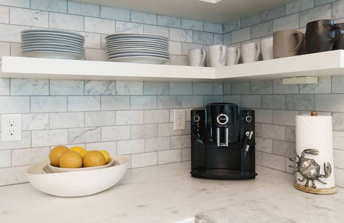The cook in your group will appreciate the beautifully appointed chef's kitchen. With its top-of-the-line European appliances (including a wine fridge for your favorite vintage) and full suite of Williams Sonoma utensils, it's a joy to use. And, with its wraparound marble backsplash and solid-surface countertops, beamed ceiling, and elegant cabinetry, it's also a pleasure to look at.