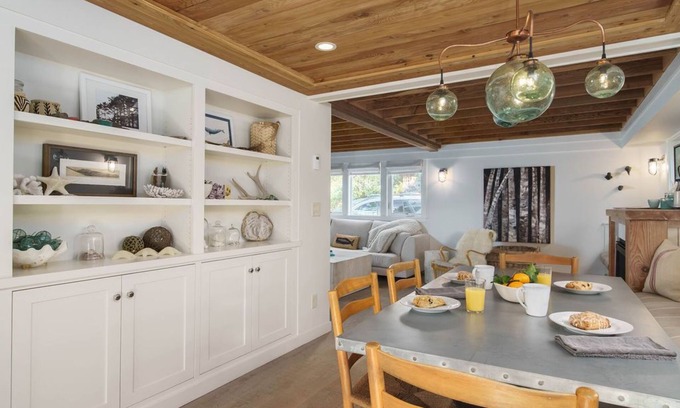 Enjoy your gourmet meals in the dining area just off the living room. There's lots to talk about here thanks to this space's elegant cabinet of curiosities full of coastal art and natural objects, as well as its custom light fixture made from salvaged Japanese floats.