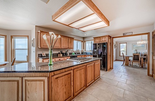 This Southern Oregon Coast vacation rental is the perfect home away from home to enjoy the beautiful Oregon Coast, right outside your front door. Stairs allow you direct access to the very private beach below.