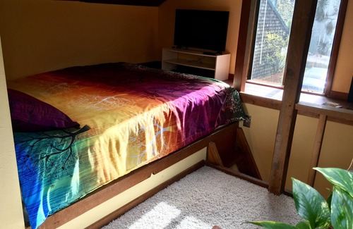 Take two steps down from the kitchen hall to reach the living room. This is a shared common space with sleeping for 2 on a comfortable futon mattress, and an adult sized beanbag chair. Up above the workspace area I have fully stocked with fresh sheets and blankets in case the futon space is used. This is also the game room, fully stocked with many classic and contemporary board games, a TV signed into Netflix for guests. A desk for working is available as well as markers and crayons for children entertainment. Sunny bay windows look west, out to your own personal side yard, and glass French doors open east to a covered back patio.