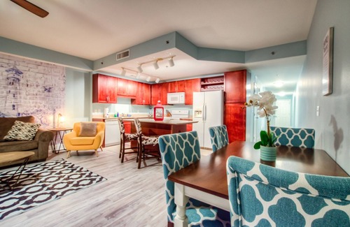 The unit has been decorated extremely tastefully and no expense has been spared for the comfort of our guests. The kitchen is fully equipped with everything you will need. Themaster bedroom has an extremely comfortable King Bed and en suite Bathroom. The bunk area is secluded and has brand new mattresses and a private bathroom. The living area is extremely spacious and open, it offers a sleeper sofa couch and brand new furniture for he ultimate luxury feel. The condo is 1050 sq.ft and it is located in the best floor- 10th. RIght across the 10th level you will find one of the best pools in the complex, hidden away and extremely close, so no elevators needed to access it.