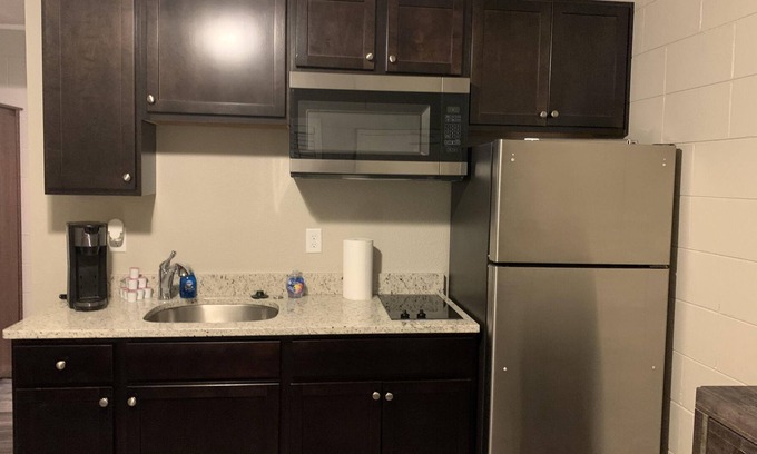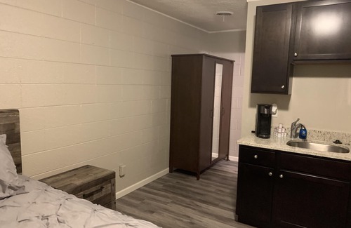 Gorgeous remodeled Studio apartment. Great for short stays for work or just needing a place to stay that is fully functional. Has one queen bed, one bathroom, and fully functional kitchenette with Stove Top. Wifi available.