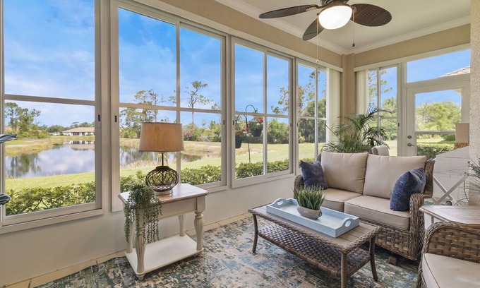 The floor plan is comfortable and accommodating and decorated with tasteful décor. Kitchen serves as the hub of your living space. Get a good night's rest in the comfortable, queen sized bed in the guest room. The den works well as an office and features a casual sitting area. Open the sliding doors to a beautifully styled lanai. A tranquil sanctuary to unwind at the end of the day looking upon the gorgeous water view where nature abounds.