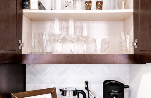 The kitchen has a full size fridge, gas stove top, Nespresso coffee station and more. This house is modern my decorated and is very spacious with a lot of closet space.