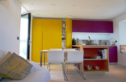 In the kitchen guests will find everything they need to transform the incomparable local fish, vegetables and fruit into healthy and delicious feasts. There is a top of the range under counter oven/grill, a gas hob, fridge freezer, dishwasher and plenty of cutlery and utensils, pots and pans. Opening the large cupboard doors in the living area will reveal shelves of beautiful crockery and glassware. Meals on the terrace are made all the more magical when the table is adorned with jewel coloured glasses, exotically glazed dishes and, of course, plenty of candles and lanterns.