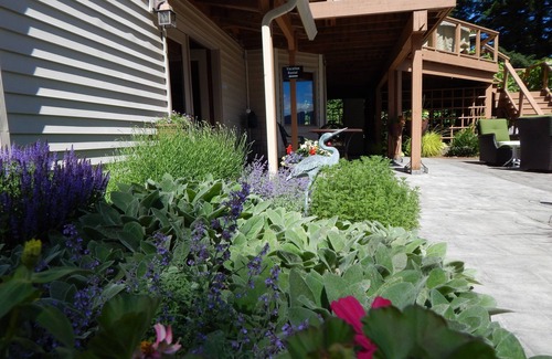 Your private entrance welcomes you to a warm and inviting 1000 sq. ft. suite. Features include a king size bed, an adjoining living room with river rock fireplace, coffee bar, refrigerator, microwave, TV, complimentary WiFi, a wide selection of books, games, and movies. The unparalleled views extend out to your private patio surrounded by lush and vast gardens.