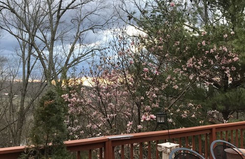 Beautiful private upstairs area of our home, with two bedrooms ...Master bedroom has a queen size bed and the second bedroom has a double futon..There are two full baths. Both recently remodeled with beautiful marble.Master bathroom with shower and one with shower and bath tub ..Beautiful kitchen and dining room and lovely deck with grill..With a beautiful view of our Forested 10 acre property.
