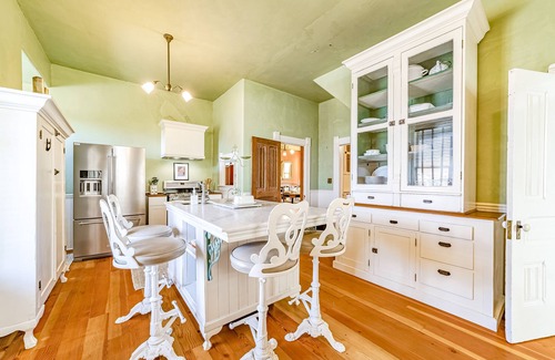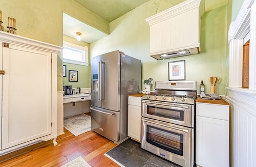 Highlighting the golden age of American architecture, the home's original features include hardwood floors, beautiful stained glass, ornate trim, and clawfoot tubs in both bathrooms (one is a combination shower/tub, the other is an extra-long bathtub with a handheld shower wand). The updated kitchen comes equipped with sparkling counters and a full suite of stainless steel appliances for handling home cooking with ease. Decorative fireplaces adorn the open living area and dining room, adding an elegant touch of ambience for family gatherings. Unwind on one of the living rooms sofas while streaming shows and movies on the smart TV or hosting a game night at the six-seater table. The formal dining room can accommodate up to eight for at-home meals.