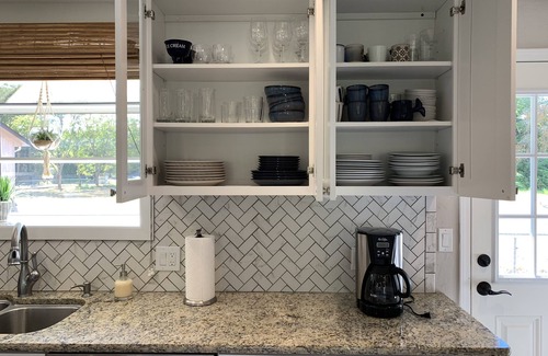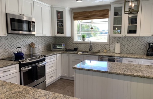 Views just get better as you go out onto patio and lawn, where the sound of the river is usually all you hear. This house is ground level and can host up to 8 people. In this open plan house, there is a plenty of room and seating areas to gather together for conversations and meals while enjoying river views. Meals can be served at the dining table and a large granite countertop peninsula. A fully equipped kitchen will provide everything you need for home cooking. The main house has three bedrooms and two bathrooms. Two bedrooms have a queen size bed, and one bedroom has a king size bed. There is an additional twin size folding bed that can be used in a bedroom or the living room. A couch in the living room can be converted into a bed as well. One bathroom has a bathtub/shower combination and is not attached. Another bathroom has a shower and is attached to the master bedroom.