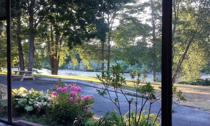 Large lawn between house and river, with BBQ and picnic table for outdoor meals. Peaceful property sits on over 2 acres of land at end of private drive, yet minutes from Grants Pass, hospital, restaurants and supermarket. No houses on opposite side of river (although there is a road) and loudest sound is jetboats in summer. Satellite TV and wireless internet provided.