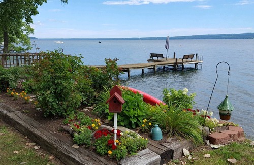 Beautiful 5* home on Seneca lake, with an unbelievable lake view from the large 235' flat waterfront property. A small 15 mph lakeside road is quiet and convenient for walking to the nearby 2 restaurants for food and/or drinks, as well as a great waterside stroll! This completely renovated home is cozy and comfortable for a peaceful getaway from home for all seasons. Enjoy the propane fireplace & heat during cold winter months or large windows for spring and summer air. Central AC newly installed! All furnishings, appliances, and bedding are updated regularly. Hardwood floors.