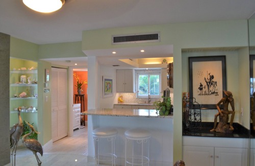 Our lovely property overlooks Vanderbilt Bay. 1500 sq. ft. Sleeps up to 6 people. Master bedroom with king size bed and private screen porch, overlooking pool area and Vanderbilt Bay. Guest bedroom has one queen size bed Property has been newly remodeled (2017) including kitchen and bathrooms. Main living area also has screened porch overlooking pool area and the bay. Cabana has pull out couch that sleeps two. Full laundry , cable and Wi-Fi. Pool that is only shared with 5 other units. Within 2 miles to wonderful restaurants and entertainment. Directly across the street is access to the beach.