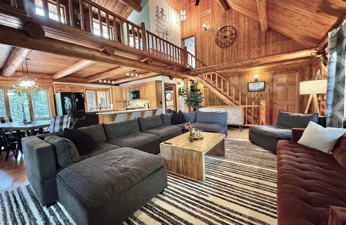 There are 6 sleeping areas in the cabin: 3 bedrooms, 1 loft, 1 main floor living room, and 1 lower level living room. The cabin sleeps 14 total people on beds: 8 on formal beds and 6 on custom pullout sofas with queen memory foam mattresses. Additional sleeping options for up to 8 are available on air mattresses and other lounging furniture throughout.
