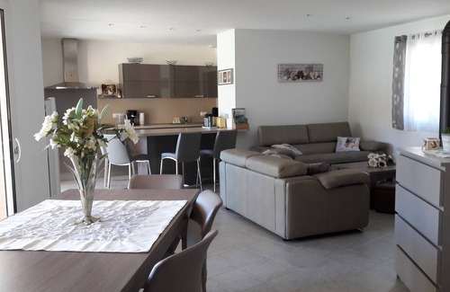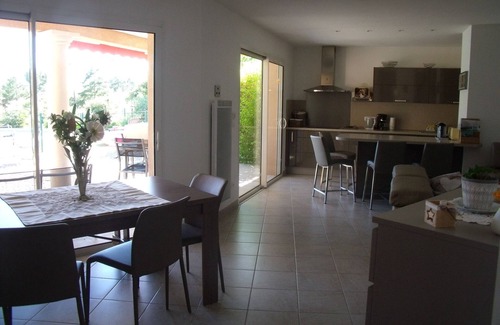 Functional single storey villa comprising very bright living / dining room, fitted kitchen open to living room with very convivial dining area and direct access to covered terrace, 3 bedrooms with fitted wardrobes, including 1 with private shower room / wc, shower room with walk-in shower, separate wc with hand basin. Heated, fenced pool with large synthetic grass beach to share with the owners, property on 4,300 m² of land with pétanque, table tennis, swing. Ideal rental for holidays with family or friends. Owners on site. Our villa is south facing in a green setting and in absolute calm.