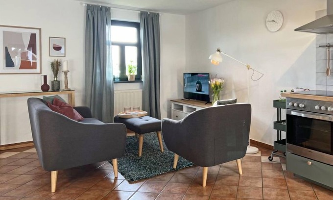 "Gotland", 3-room apartment 55 m2 on 2 levels. Fully renovated in 2022, beautiful and modern furnishings: living/dining room with dining table and satellite TV (flat screen). Kitchenette (4 ceramic glass hob hotplates, toaster, kettle, electric coffee machine). Shower/WC. Upper floor: 1 room with 1 double bed. 1 room with 2 beds. Gas heating. Facilities: baby cot. Internet (WiFi, free). Please note: non-smokers only. Private entrance, smoke alarm.