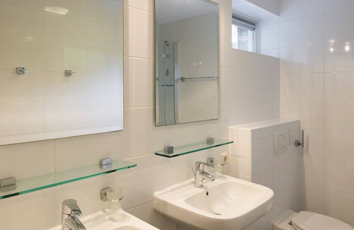 In the basement there are three bedrooms and two bathrooms, one of which is en-suite. Each bedroom has two single box spring beds. The en-suite bathroom has a shower, double washbasin and a toilet. The other bathroom has a shower and a washbasin. There is also a separate toilet in the basement.