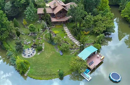 Welcome to Grace Woods! Escape to this stunning estate featuring 2 homes, a private 5-acre lake, and serene waterfalls. Enjoy fishing, kayaking, or lounging on the docks. The Lake House offers 4 BRs, a bunk room, and spacious decks while the Hideaway boasts 2 BRs and a tranquil deck. Outdoor highlights include fire pit, dock, water trampoline, water lily pad, peddle boat, and hiking trails. Perfect for family gatherings, reunions, corporate retreats.