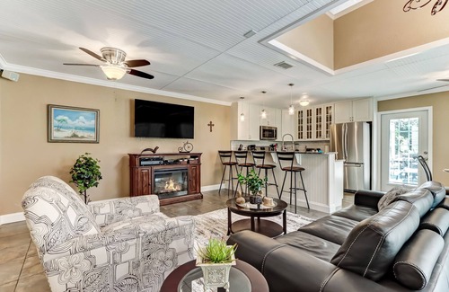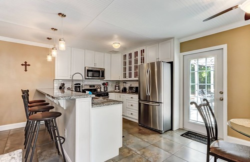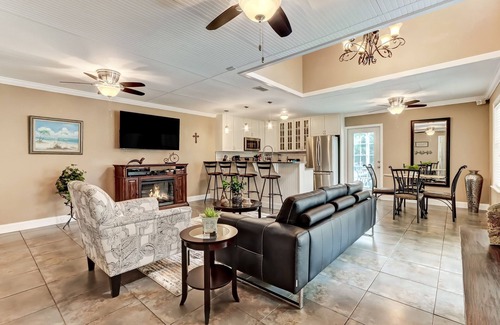 Come enjoy the magic of this post-antebellum property which has been tastefully upgraded to reflect present day luxury and style. This beautifully renovated guest house is in a historic tree-lined Orange Park neighborhood. It offers an open concept living area with a fully stocked kitchen, top grain leather sofas, glowing ambiance from the fireplace console, and a larger than life 65" HDTV with surround sound. The kitchen has a granite bar top with 4 bar stools. There is a separate dinette. The large master bedroom has an elegant ensuite with double sinks and a luxurious marble/glass rain shower. A separate loft bedroom sleeps 6. To enjoy the fresh air, sub-tropical flowers and majestic trees, step out your door into a stately (lighted) pergola, which is outfitted with a firepit, and outdoor furniture for comfortable living day and night; indoors and out.