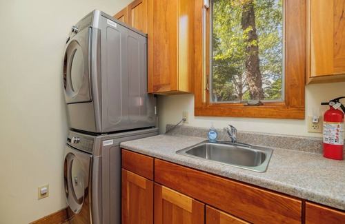 The first primary bedroom on the main floor can accommodate 2 adults and features a king bed, fantastic water views, a 70-inch smart TV, plenty of drawer space and space for hanging clothes, window shades, a ceiling fan, and 2 Qi wireless charging devices (to charge your smartphone or tablet). The primary bedroom has an ensute bathroom with a walk-in shower, jacuzzi tub with views of the lake, a double vanity, and a large walk-in closet. The queen bedroom on the main floor can accommodate 2 adults and features a queen bed, water views, a 50-inch smart TV, drawer space, window shades, and 2 Qi wireless charging devices (to charge your smartphone or tablet). The main floor also includes a newly renovated half bathroom and the laundry room.