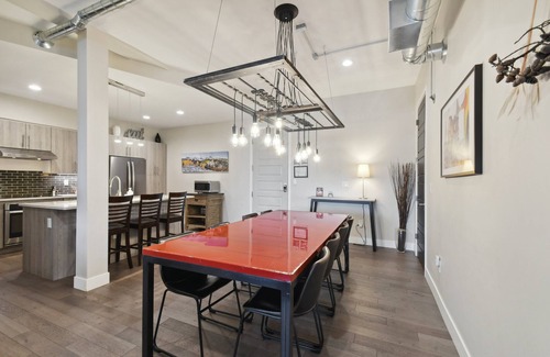 It's a super rad place with a modern industrial vibe, updated amenities, and unique interiors, like the incredibly cool dining room table—a masterpiece of repurposed, sustainable furniture. This was once the door to the condo's master bedroom, craftily repurposed into a sleek and stunning Ferrari red dining room table with an epoxy finish and space for 8!