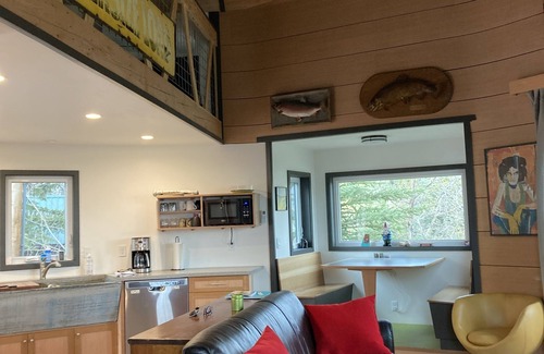 A unique grain bin (silo) dwelling nestled in trees, located three blocks from award-winning Philipsburg Brewery, restaurants, and shopping. Complete with fire pit, gas grill, TV, internet, radiant heat floors and washer/dryer. Enjoy the mountain and valley views from the deck. Just minutes away are Discovery Ski Area & Mountain Bike Park, Granite ghost town, sapphire mine, Rock Creek Blue Ribbon trout stream, Fairmont Hot Springs & Golf Course, Pintlar Wilderness, and Georgetown Lake. The Silo house is 75 miles from Missoula and 138 miles from Bozeman. Access the main level from the front door at street-level via footbridge, or from the back door on lower level via the alley and yard. Two small bedrooms with king-sized beds are located on the lower level, as is a common TV area and full bath. The couch (click clack style) in common TV area also folds out for small sleeping area for child or small adult. On the main level is an open-concept living room, kitchen, eating nook, half bath, and deck access. Ladder stairs (alternating tread) lead to the open loft which overlooks the living room area. The loft has two twin beds and a tv, perfect for kids. Enjoy this unique owner-built home while exploring Philipsburg and surrounding Flint Creek Valley. ***ATTN WINTER RENTERS- in snowy winter weather, 4-wheel drive may be needed to get up the hill (3 blocks) from downtown to our street as the hill is very steep. You may need to also shovel the walkway from the street to the front door on your arrival. ***