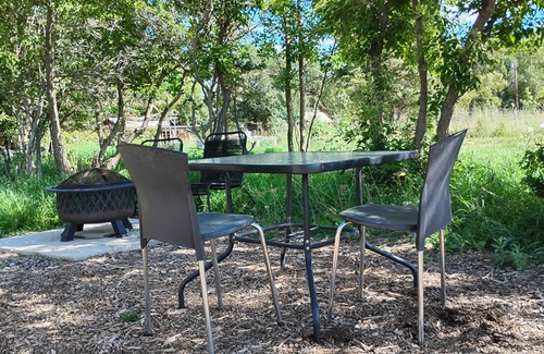 It's surrounded by fields in front & evergreens in the back, with a seating area outside.