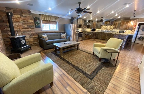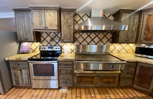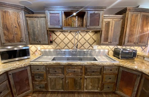 The jaw-dropping barn wood kitchen will wow you with its huge bar, complete with bar stools to sit and enjoy an ice-cold drink. The fully equipped kitchen comes with a flat top grill, commercial sink, stovetop, fridge, microwave, toaster oven, pizza pan, baking dish, cookie sheets, pots, and pans, and a dining table with 4 chairs. There's also a washer & dryer and a full bathroom with a walk-in shower and barn wood vanity, continuing the rustic theme.
