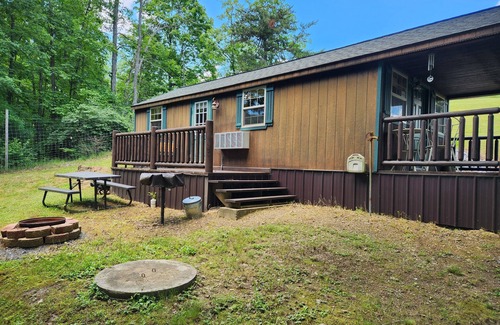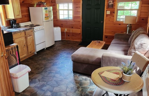 Beautiful clean cabin in the woods that sleeps 2-3 guests. 1 Full Bed, 1 Queen Sleeper Sofa. Kitchen, Living area with Roku TV, 1 Full Bath, front/back porch. All linens for beds, bath and kitchen provided. Pool, horseback rides,