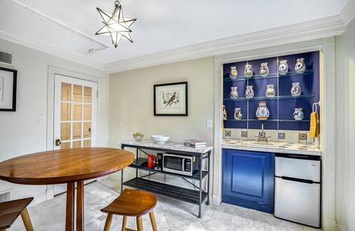 On the top level, you'll find 4 generously sized bedrooms and 3 full bathrooms. The primary suite is a sanctuary of luxury, boasting an exquisite antique Italian carved bed, seating around a fireplace, views of the back garden, dual closets, and a spa-like ensuite bath complete with built-in vanity, dual sinks, and a walk-in shower. Three more bedrooms with double, queen, and king-sized beds furnished with a tasteful blend of Italian antiques and contemporary furnishings are on this level.