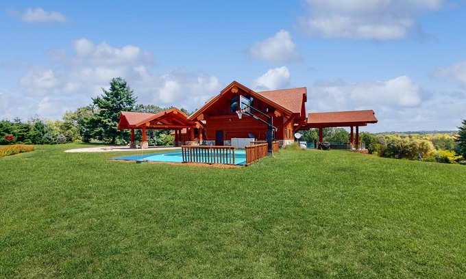 Prepare for days of cabin fun, including in ways you never thought were possible! This cabin, made with red cedar logs and geothermal heated floors, includes a 360-degree view of the natural scenic surroundings. Cherry Knoll is a private estate surrounded by 72 acres of rolling meadows, along with a natural pond fed by two aquifers and stocked with bluegill and trout for guests who bring fishing poles! Enjoy it all from four different swings, each set up perfectly to enjoy the view of the lake. The cabin is located near a bee farm with 500,000 bees, walking trails, bike riding paths, fishing spots, a golf driving range, and lots of nature-watching opportunities. Outdoor games are in abundance at this home - enjoy a giant Connect Four set, horseshoes, a bean bag toss, and more! The firepit and barbecue pit are likely to become the centers of activity during your stay.
