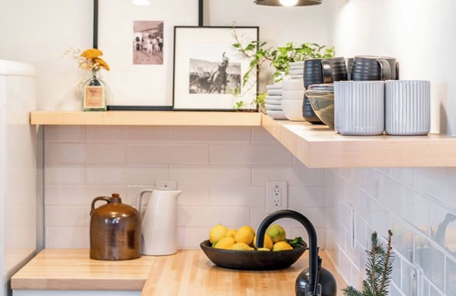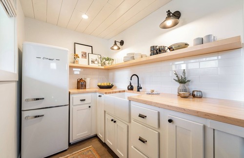 Combining the reclaimed wood from the original 1920s carriage house with modern luxuries, including a full-sized bath room with Kohler soaking tub. Our kitchenette is fully stocked with a full-sized refrigerator, microwave and 2 hot plates and a top of the line convection oven for cooking. There is also an outdoor bbq grill.
