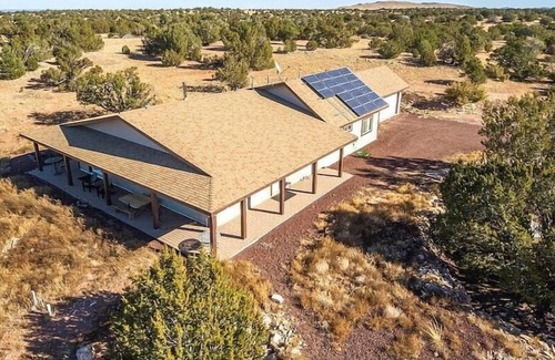 Private, off-grid living with all the essentials of a modern home! Located 35 minutes from the Grand Canyon south rim entrance, enjoy the countryside in comfort in this single level, 3000 sq. ft. home featuring 3 huge master bedrooms all with en-suite bathrooms, walk-in closets, 2 living areas, a large kitchen and covered porch with outdoor dining. Perfect for large groups. Nestled on 36 Acres. You'll experience wildlife and star gazing, as well as games and entertainment for the whole family!