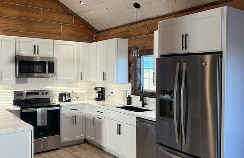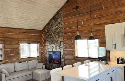 This delightful log home offers a cozy stay for up to 4 guests. Offering two bedrooms featuring king and queen beds, a beautiful kitchen with peninsula and seating in addition to a dining area with a beautiful open concept feel. The bathroom is equipped with a hot shower and vanity with ample lighting. Heating and cooling is provided in each bedroom and in the great room with separate temperature controls. Also an electric fireplace with optional heating is the centerpiece of the living room.