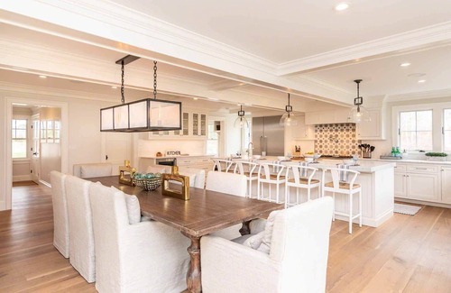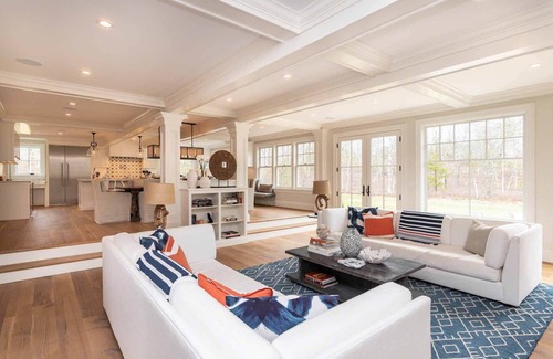 POINT B EXCLUSIVE - This recently built luxury home features three floors of deluxe indoor living space, with nicely integrated outdoor space as well. The interior architecture and design was overseen by noted Vineyard architect Chuck Sullivan. The first floor features a modern layout with an open Great Room with Living, Dining, and Kitchen Areas, framed by walls of glass windows and doors that open to the outdoor spaces.