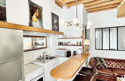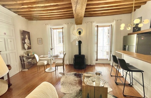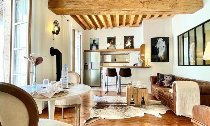 This popular apartment is absolutely charming, guests rave about its comfort and the ideal location near the pedestrian section of the famous Carnot Street, open-air market street, Place des Halles and Hospices de Beaune. This one-bedroom, one-bathroom apartment features a modern, stylish stone bathroom with a comfortable shower. Large living area with exposed wooden beams, leather Chesterfield couch, dining table with linen chairs, open kitchen with counter bar and high chairs and a real Cast Iron FirePlace. Book this lovely apartment and step outside every morning to be spoiled for choice among the best pastry shops, gourmet stores, cafés and restaurants around!